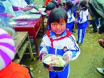 4月1日,贵州黔西县红板小学全体学生拿着崭新的钢制饭盒,吃到第一顿免费午餐,个个狼吞虎咽,一扫而光。听说没吃饱的还可以加餐,许多学生一路小跑去添饭,个头矮小的二年级学生李正福加了两次才说饱。