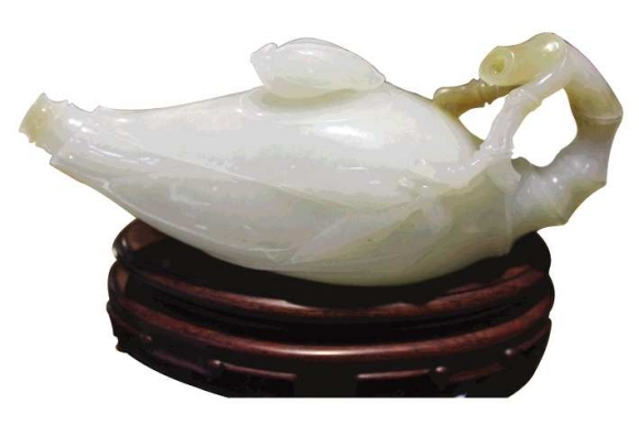 这是一款复古竹节玉壶,长17.2厘米,高6.5厘米。采用上乘和田玉原石精雕而成,玉质细腻、油润,颜色白伴有糖色,整件作品从壶嘴到壶把自始至终以竹节贯穿,造型细长独特,既有中式古典美又附有西式神灯之感,自古玉壶就为上层收藏首选,感兴趣的读者可以继续到银座商城六楼宝至尊专柜鉴赏。