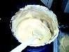 取1/3的蛋白霜放入蛋黄糊中,轻轻搅拌均匀。(使用刮刀,千万不能使用打蛋器,以免蛋白霜消泡)将搅拌均匀的混合物一起倒入剩余的蛋白霜中。继续使用刮刀搅拌均匀。搅拌时间要短,不能太长,这个是蛋糕制作成功与否的1/4部分。然后将搅拌好的蛋糕糊倒入蛋糕模具中(模具底下铺层油纸);