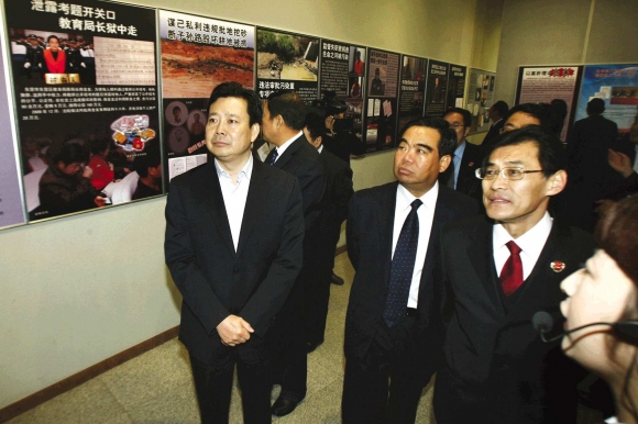 7日,在青岛市博物馆,山东省委常委、青岛市委书记李群(左一)等领导同志参观全国检察机关惩治和预防渎职侵权犯罪展览。本次展览分为宗旨使命、犯罪危害、惩治成效和警示启迪等7个部分,在青岛巡展7天。 本报记者杨宁 摄影报道