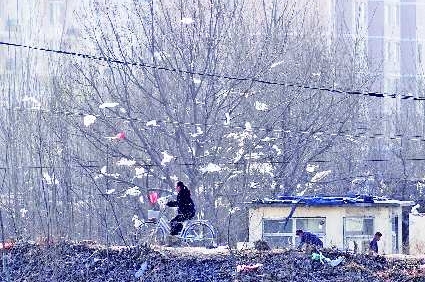 4月6日,春天是树木生长新叶的季节,在德州大学路边岔河大桥附近的一处树枝上却“长”出一树塑料袋,迎风招展。 本报记者 马志勇 李继远 摄影报道