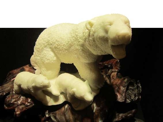 从8日开始,山东省福建商会在金沙大酒店为潍坊带来一场极品寿山石展,图为“母子情深”的雕刻作品,由一整块奶白色的芙蓉石雕刻出了三只生动的北极熊。 本报记者 郑雷 摄