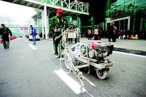 7日,在潍坊火车站二层,工作人员正在喷涂标线。自8日凌晨开始,潍坊火车站进出站方式将进行调整,由原来的西口进东口出,改为东口进西口出。为此,交警部门对火车站的进出站标志、道路标线进行更换和喷涂。