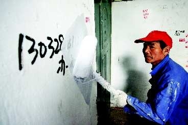 7日,在潍坊市松园子社区,工人正在清理墙面上的小广告。为了创建文明城市,社区居委会组织人员对社区里的小广告进行统一清理,对污损严重的墙面进行粉刷,为市民创造一个良好的居住环境。