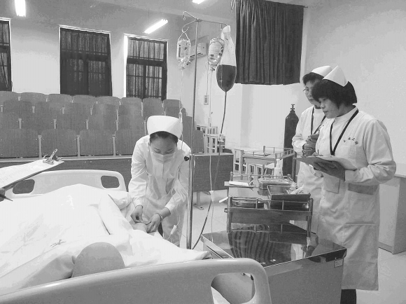 9日下午,历时两天的2011年山东省职业院校中职组护理技能大赛拉开帷幕,15支代表队的60名选手角逐3项比赛。本次除了继续保留上届比赛内容外,还新增了急救护理内容,首次采用选手操作画面现场同步直播的方式。图为参加静脉输液比赛的选手正在认真操作。