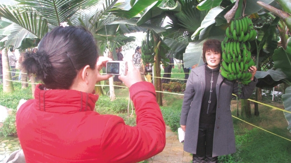 天津游客与香蕉合影留念。 本报见习记者 王世腾 摄