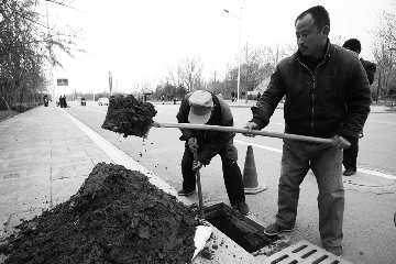 10日,在潍坊市飞机场路上,工人正在清理雨水井里的垃圾。为了保证夏季各个雨水井能顺利排水,市政部门对道路两侧的雨水管道进行疏通,清理井中的垃圾,防止出现雨水存积的情况。