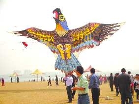 一群人簇拥着一只巨大的雄鹰来到沙滩上,一下就把现场市民的目光吸引住了。这只长16.2米、高9.6米、重达60公斤的巨鹰曾在第四届世界风筝锦标赛中获“最大类”冠军,并将申报吉尼斯世界记录。除了巨型风筝外,临沂特技风筝队现场还放飞了“光轮”特技风筝,直径20多米的七彩光轮在空中飞舞,煞是好看。