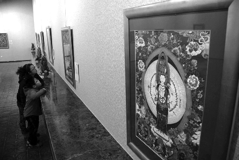 10日,在青岛市美术馆,市民在参观由僧人桑吉卡创作的唐卡艺术作品。“唐卡”系藏文音译,也称“唐嘎”等,是刺绣或描绘在布、绸或纸上的彩色卷轴画。该展览将于4月13日上午结束。