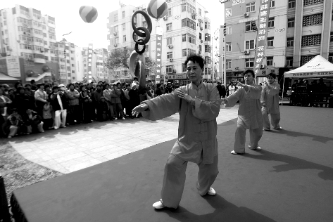 9日,青岛第十届社区健身节暨全民健身月拉开大幕。本届健身节共分健身操表演比赛、家庭趣味运动会等六个项目。全市预计将有百余个社区近万名市民参赛。图为9日上午,在青岛体育街,社区的居民正在表演太极拳。 本报记者 杨宁 摄影报道