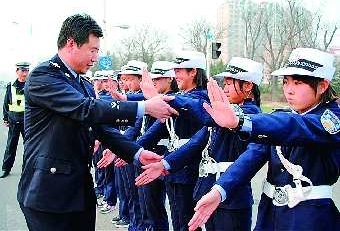 4月8日下午,在威海交警三大队民警的带领下,全市首个安全教育基地凤林学校的首批12名“小交警”来到青岛南路天东路口,实地演练了交通指挥的手势,学习了交通安全常识。图为,民警正在纠正小交警们的手势。 本报记者 吕修全 本报通讯员 刘金龙 宋协广 摄