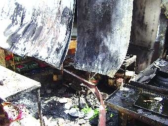 13日上午记者看到,该饭店后厨和前台两个门挨着,后厨已被烧得面目全非,一片狼藉,前台及包间则部分被烧。前台门口,左眼肿得发青的韩师傅正眯缝着眼收拾着火灾后残存的香烟。