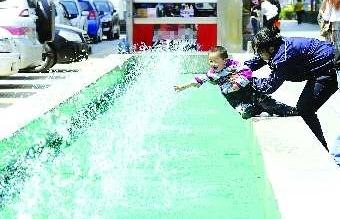 4月13日,在济南金街泉城路上,市民们正在喷泉前戏水。当日济南最高气温达到27摄氏度,而泉城路上形态各异的喷泉给市民们带来不少清爽与欢乐。