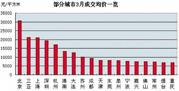 搜房网数据监控中心监测统计的53个大中城市中,两成城市3月住宅成交均价在10000元/平米以上,其中北京、三亚、上海位列前三,住宅成交均价分别为30611元/平米(为别墅成交均价)、21197.86元/平米、21003元/平米,深圳的成交均价为19423元/平米,也接近20000元/平米。
