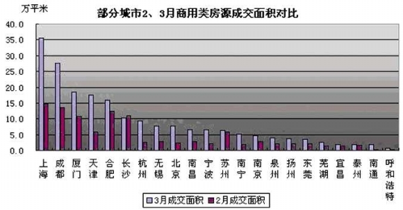 数据来源:搜房网数据监控中心上海商用类房源成交35.5万平方米,为3月商用类房源成交面积最多的城市,其次为常州成交34.3万平方米,成都成交27.6万平方米。此外,厦门、天津、合肥、长沙等城市商用类房源成交面积均在10万平米以上。北京3月商用类房源成交7.66万平米,未进入成交面积排行榜前十。