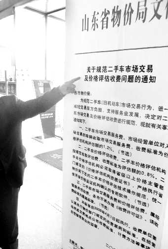 13日,记者走访了幸福南路上的多家二手车交易市场。在其中一家交易市场的交易大厅里,两米高的公告牌特别醒目,公告牌上显示着“二手车市场交易服务费,收费标准为价格评估机构评估额的1.2%……二手车价格评估收费,收费标准为评估额的0.8%……二手车市场交易服务费和价格评估收费,属经营服务性收费……”等字样。“这些收费标准都是山东省物价局规定的标准,公示出来是为了让消费者一目了然,避免上当受骗。”该交易市场的工作人员表示。