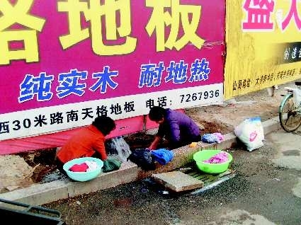 作品描述:路边工地正向墙外排水,附近的市民赶紧来顺便洗衣服。