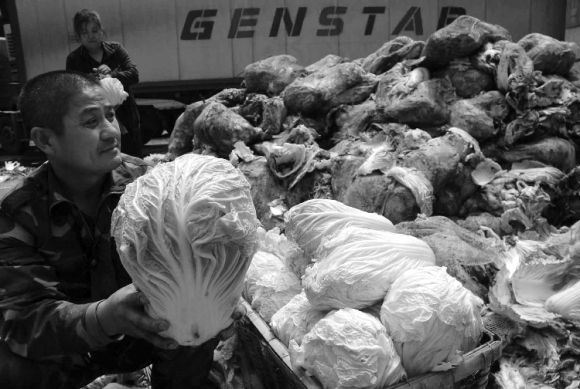 13日上午11点半左右,在青岛抚顺路蔬菜副食品批发市场,虽然已经过了早上蔬菜交易的高峰期,可来自东北的杨申军还在和妻子忙着整理自己摊位上的大白菜。