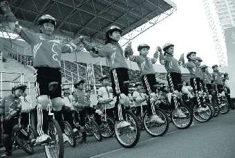 13日,在弘诚体育场,青岛平安二小的同学们正在进行独轮车表演。据了解,他们是在为14日举行的四方区中小学春季田径运动会开幕式进行彩排,此次运动会为期两天,共有30余所中小学的运动员参赛。 本报记者 张晓鹏 摄影报道
