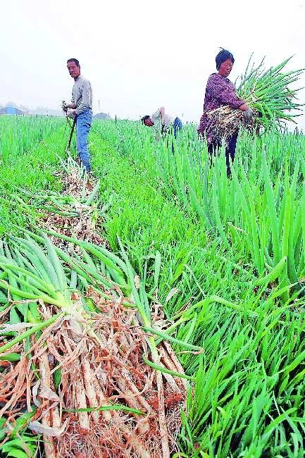 图为14日章丘市宁家埠镇明家村的蔬菜经纪人在低价收葱。