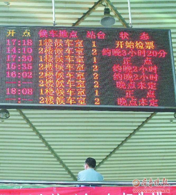18日下午5点,潍坊火车站候车厅的电子大屏幕上显示,途经潍坊的多趟列车晚点,一位旅客靠在候车厅的栏杆上等待列车的到来。当日13时33分,因青岛市快速路施工苫盖的篷布被大风刮到铁路接触网上,造成胶济铁路1km+50m处接触网故障断电,致使济南铁路局部分列车延误和停运,近万名旅客滞留沿线。 本报记者 孙国祥 摄