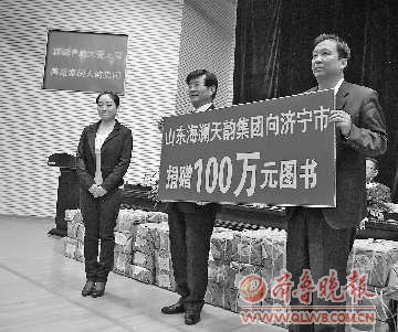 14日,山东老区促进会联合海澜天韵集团,将价值100万元的图书赠给济宁市,带动和促进济宁革命老区教育事业的发展。图为济宁市教育局局长闫志强(右),接受赠送图书。