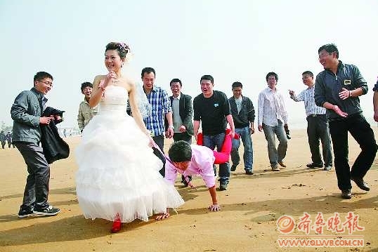4月16日,万平口海滩,一对举行婚礼的新人通过做游戏的方式接受好友的祝福。