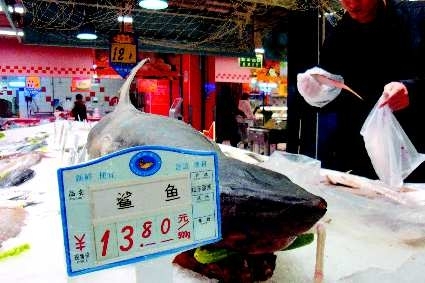 18日上午,记者来到大润发超市。在海鲜专柜上,记者看到一个大鲨鱼头摆放在显眼的位置,在鲨鱼头旁边是红色的鲨鱼肉。路过的顾客不少停下来好奇地观看,不少人拿起手机拍照。“鲨鱼在超市出售,这倒是头一回见,个头还真不小。这得多大的锅才能装下啊?”一位顾客调侃道。