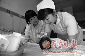 18日,在青岛海慈医院,产科护理人员正在为一名宝宝做护理。当日,该院举行母婴床旁护理比武。据了解,以前医院给新生儿洗浴,都是由护士带到专门的洗浴间进行,而母婴床旁护理服务则是由护士来到床旁,在母亲的注视下给孩子洗澡,这种人性化的服务受到了产妇及家属的欢迎。