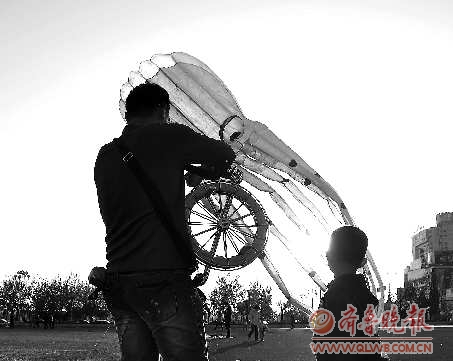 4月18日,德州中心广场上,一对父子正试图放飞一只巨大的章鱼风筝。由于风力有所减弱,空气中的浮尘已降低。 本报记者 苏超 摄影报道