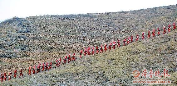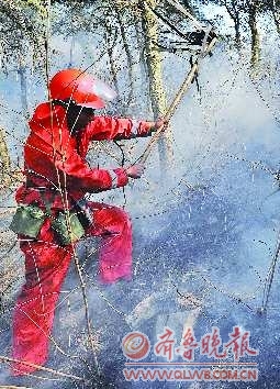 风向不定让火势再一次蔓延,济空的直升机一直在山火上方盘旋。济南、莱芜、泰安、淄博等地的武警、消防、公安甚至一些机关单位的公务员,越来越多的专业及非专业灭火队伍聚集各个火点,在连绵的山上,一条条长长的队伍,一声声互相鼓劲的呐喊声,汗水和烟灰交织、脚步与力量同行,脸蹭破了、鞋烧穿了、嗓子干哑了都无所谓,只要将这火魔战胜!