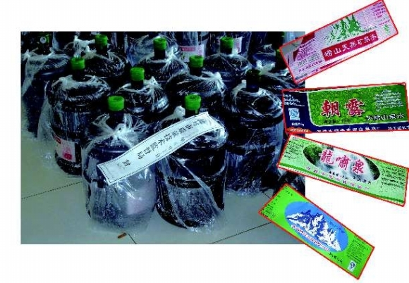 民警现场没收了大量假冒的“沂水县沂蒙雪山矿泉水”合格证GB8537-1995和“健康饮用水”合格证,还有15000余份的其他假冒品牌的标识,分别是青岛新源祥饮料厂“天然泉水”和青岛崂恒饮料有限公司“崂山天然矿泉水”,潍坊乐龙嘴直饮水厂“龙啸泉天然泉水”和潍坊市坊子奇霖山泉水厂“朝露天然山泉水”。据了解,这些标识都是从别的大桶水生产处偷拿来的。