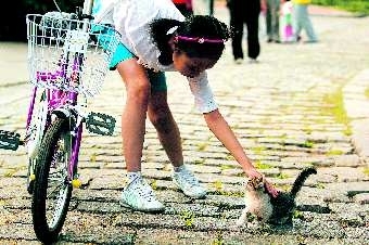 9岁的女儿特别喜欢小动物。一天骑自行车时,看见一小猫,忍不住停下来上去摸它,此时我抢拍下这个镜头。 (毕建英)