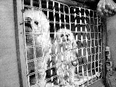 19日,在白春街某号楼,刚踏上五楼楼梯,便清晰地听见楼上传来一阵阵狗叫声。6楼楼梯的扶手上立着一根铁管,铁管上方横向固定了两根铁棍,形成了一个长和宽各一米左右、高大约两米,向外凸出的空间,正对着六楼那户居民家。这个向外凸出的空间,被“很好”地利用了:下面一米左右是一个锁着的柜子,中间是狗笼,里面养着两只小白狗。狗笼上面堆放着杂物。