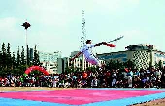 作品描述:在招远市第一届武术比赛的赛场上,一位功夫健儿挥刀腾空跃起,大有欲上九天揽月之势,引得满场喝彩。