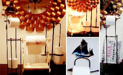 铁制小船纸巾架,采用黑色铁艺,设计为两用,横轴放置卷纸,下方圆筒则可以放报纸杂志。白色铁艺纸巾架用了花蔓的设计元素,S形和白色更显雅致,而下方搁板则可用来放置香皂盒。铁制小鸟纸巾架设计了三根立柱,可以充分利用空间,,抽掉立柱的上半部分则是烛台的造型。