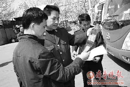 19日,市中区交通运输部门对辖区重点运输车辆的GPS、消防器材、救生设备和车辆性能进行全面检查,消除事故隐患,确保“五一”节假日期间道路运输市场安全。图为交通工作人员正在检查客运车辆营运手续。