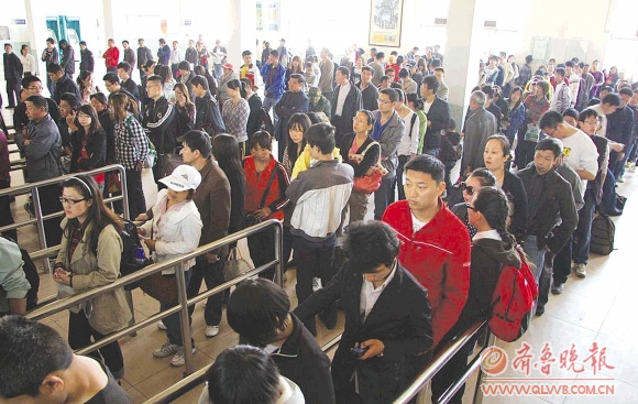 19日上午,记者在泰山火车站和泰安汽车站了解到,五一长假即将到来,不少市民和学生为避开客流高峰期而选择把出行日期调整到4月28日、29日,提前出行,这使得火车站和汽车站的车票销售高峰提前到来。图为在泰山火车站排队等候购票的市民。