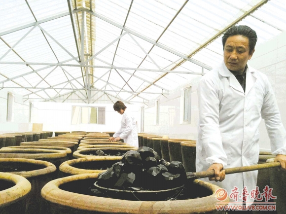 在陈森平的咸菜车间,记者看到车间顶部的构造是一排类似加厚玻璃材质的塑钢瓦,即透光又可以遮风挡雨,方便咸菜晾晒。一排排腌制咸菜的大缸排成几列,延绵十余米。陈森平说,作为果都咸菜的主打系列,“辣菜疙瘩”是酱菜场的主要加工产品。“辣菜疙瘩”一般经选料、预腌、二次修整、拌料、密封、复晒、加料、再密封和腌制等十几道工序加工而成,加工后的辣菜呈黑褐色,只有原重量的一半左右,存放越久味越香。