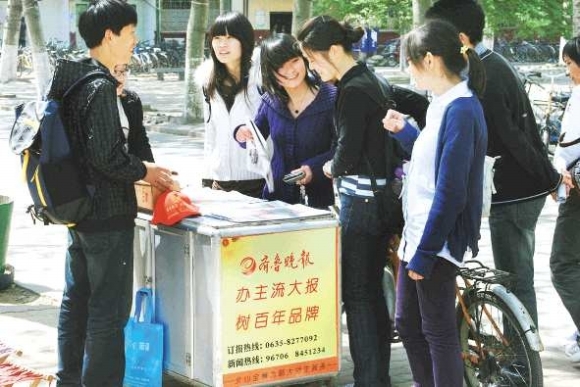 19日上午,本报爱心售报助学岗在聊城大学上岗。15名贫困生推着本报提供的5辆报车,通过卖报勤工俭学。本报爱心售报助学岗的报车还将推进山东技师学院和聊大东昌学院等院校。