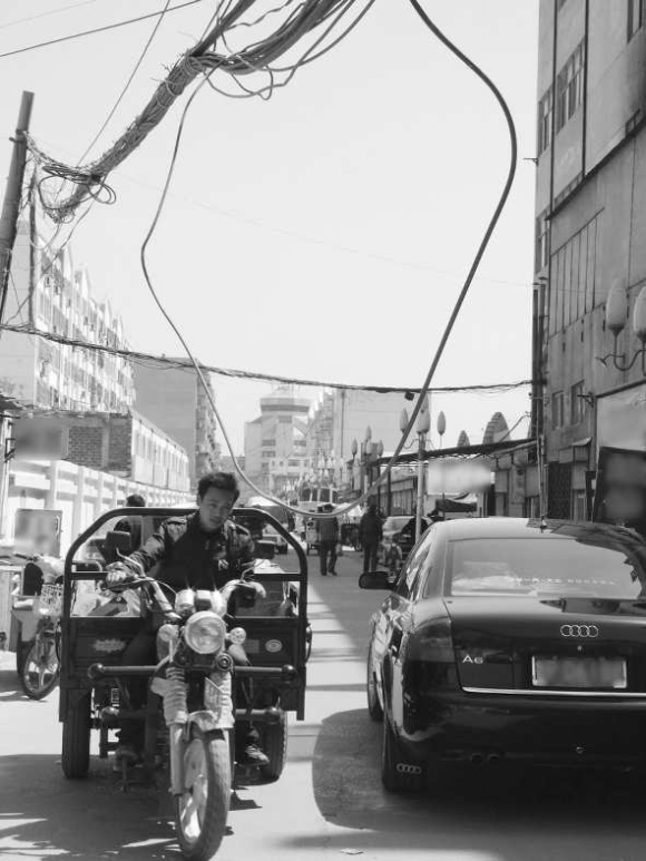18日,市民骑车躲让垂下来的线缆。铁塔商场附近的聚源巷西首,一处横跨街道的线缆垂落形成一个U型套索,距离地面仅有1.4米左右。居民说,线缆是一辆小货车经过挂下来的,几天来一直没有人修整。