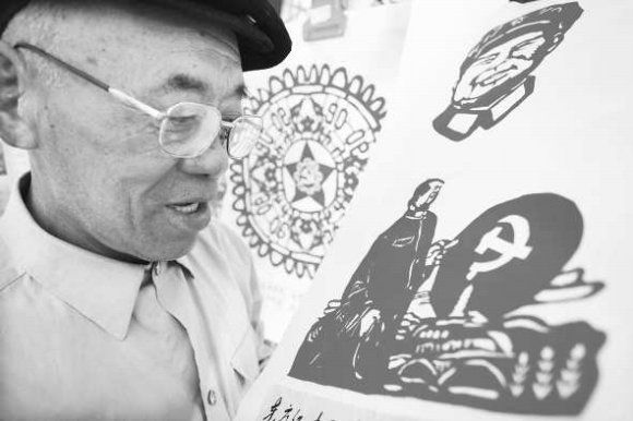 4月19日,家住聊城市新区办事处王官屯村,70岁的王金范,用红纸剪出“喜迎党节”、“东方红”、“党旗飘飘”等图案,庆祝建党90周年。
