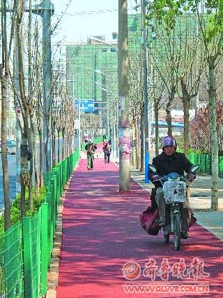 扈玉坤介绍,这叫做彩色过街通道,在玉兴路沿线的七里山路、土屋路、水厂路、旅游西路四个较大的路口,都设有这样的彩色专用道。“与彩色沥青路面不同,这种路面采用彩色涂层,防滑效果很好。”他说,过路口时,行人从斑马线上通过,自行车就从这条红色的专用道上走。