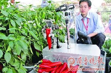 20日上午,寿光菜博会开幕。图为菜博会未来馆内,机器人“剪刀手”正在采摘成熟的红辣椒。