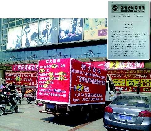 本报4月20日热线消息(记者王琳)20日,潍坊银座商城的一位负责人李先生向记者反映,银座商城搬到“新家”四个多月,可现在居然有人在风筝广场旧址进行清仓大甩卖。李先生认为,该厂家在广告中几次提到银座,极易让消费者误解成银座在清仓甩卖。目前,潍坊银座商城已委托律师,向对方发出律师函。
