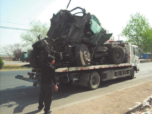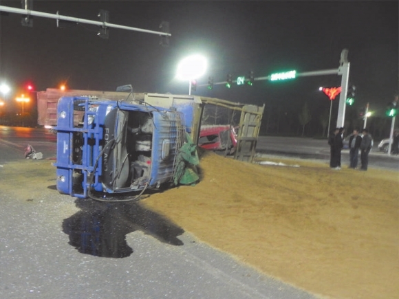 一过路口,六轮拉刹车侧翻在胜利街西北侧。