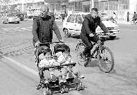 作品描述:一对双胞胎坐在爷爷推着的新款童车里逛街,这一幕引来许多路人羡慕的目光。