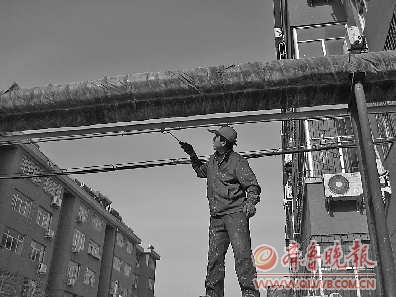 德州市创卫工作已进入最后攻坚阶段。日前记者走访了德城区恒丰小区、岔河小区等部分社区,居民们都说,随着创卫工作的深入,社区居住环境都有了明显的改善。20日上午,恒丰小区,一位师傅在粉刷掉漆的天然气管道。 本报见习记者 邹成玉 黄婷婷 摄影报道
