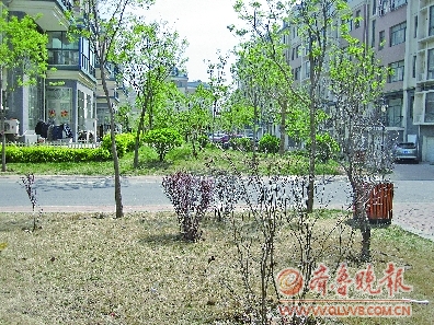 20日上午,记者在高地世纪城小区看到,10号楼至18号楼前的绿化带里草木均已枯黄,而一路之隔的另一片绿地里草地和树木均是绿油油的(如图)。“那边的绿地都浇过好几次水了,这边还没浇过,看着树和草都枯死了,挺可惜的。”赵女士告诉记者,她和部分居民还曾从自己家拎水浇灌绿化带,但起到的作用不大。“物业费都交了,为什么物业浇灌绿化带却不给这片浇呢?”