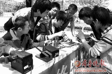 4月20日上午,枣庄学院物理系的学生正在给同学免费维修电器。据了解,物理系部分学生组成家电维修服务团,利用课余时间进驻校园、走进社区,为广大市民服务,做到了学以致用,给大家带来了便利。 记者 展萍 张帆 摄